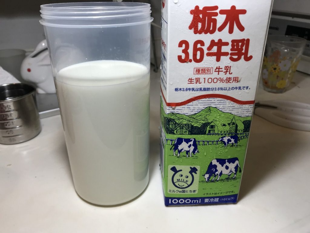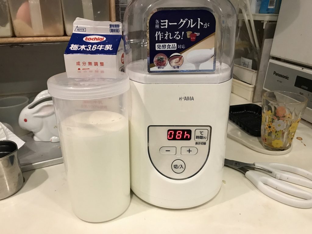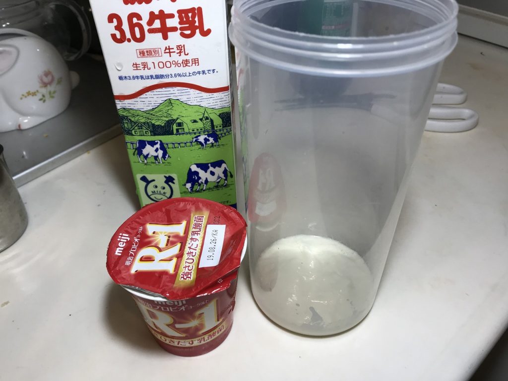 牛乳と好きなヨーグルトを買ってきて、常温にする。(つまり冷蔵庫に入れずに暫く放置しておく)