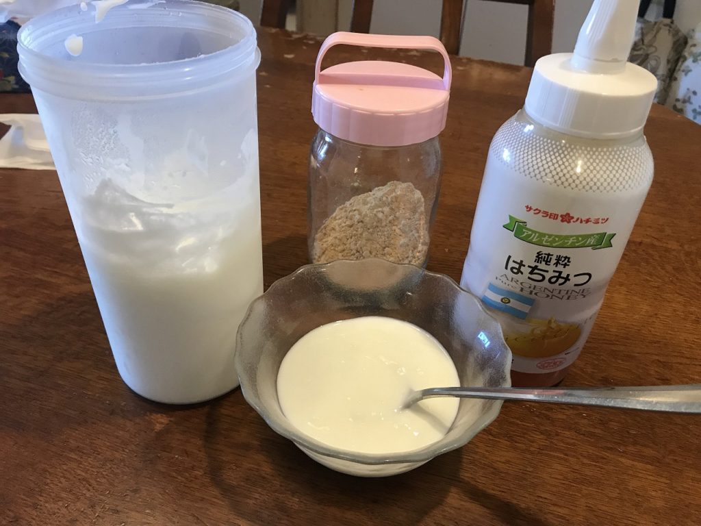 基になるヨーグルトの量はよっぽど少なくなければ、ヨーグルトができると思いますが、私は大さじ一杯のヨーグルトを入れています。
