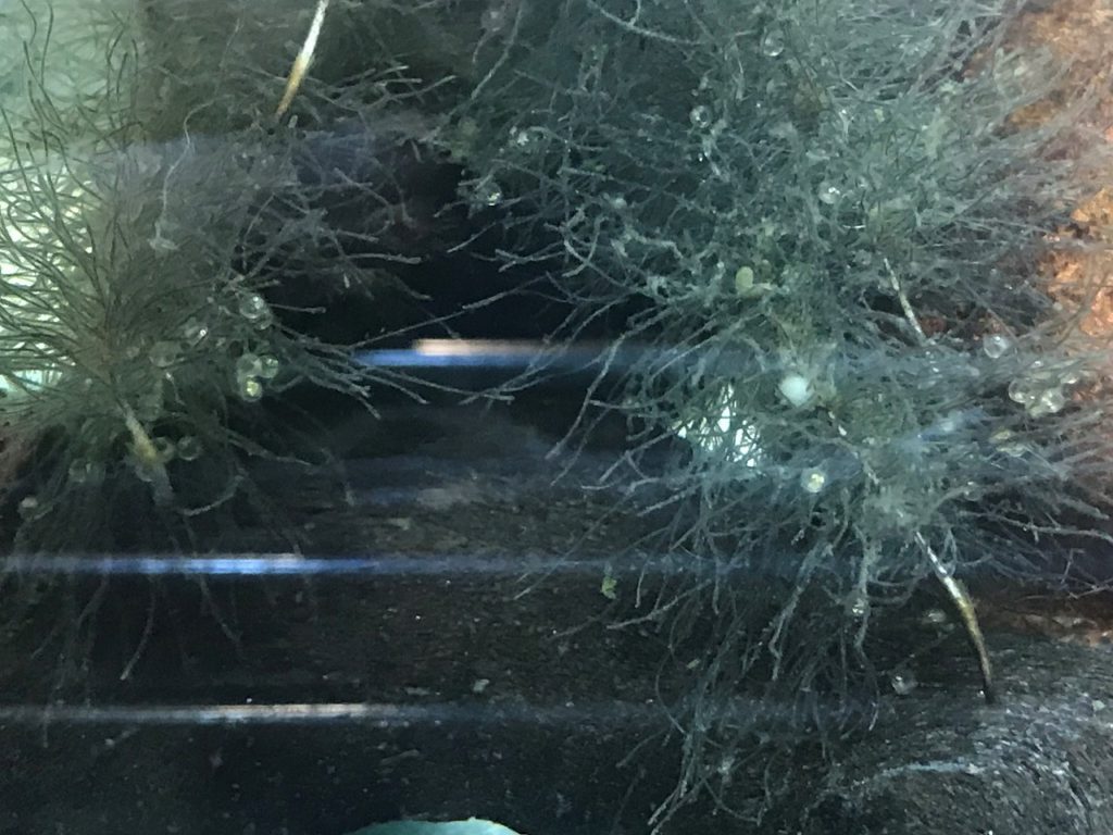 そしてよく見ると水槽の中のアナカリス(藻)にも卵が産みつけられていることが分かりました。