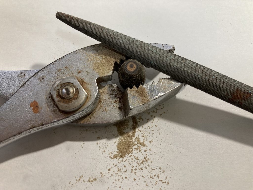 ハスの種は思ったより硬くプライヤーでしっかり掴んで、金属製の棒やすりで種のへこんだ側を削りました。