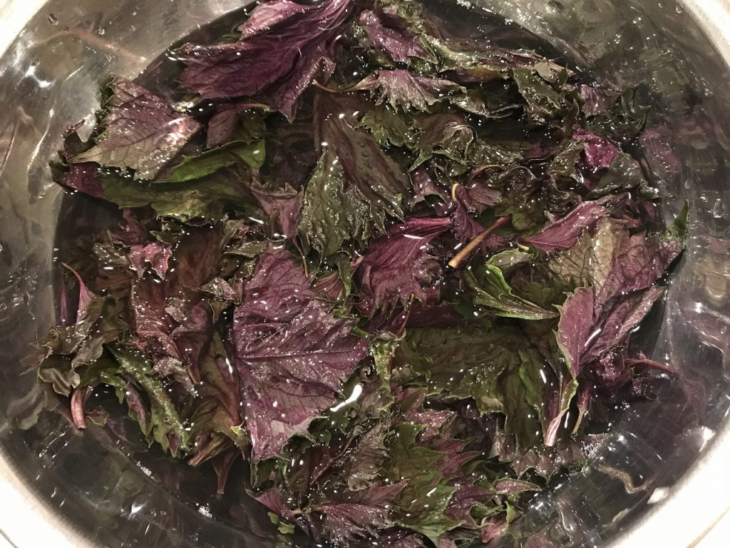 分量は水2ℓ、紫蘇の葉380g、粗糖380g(紫蘇の葉と同量)、酢とポッカレモン合わせて100㎖です。