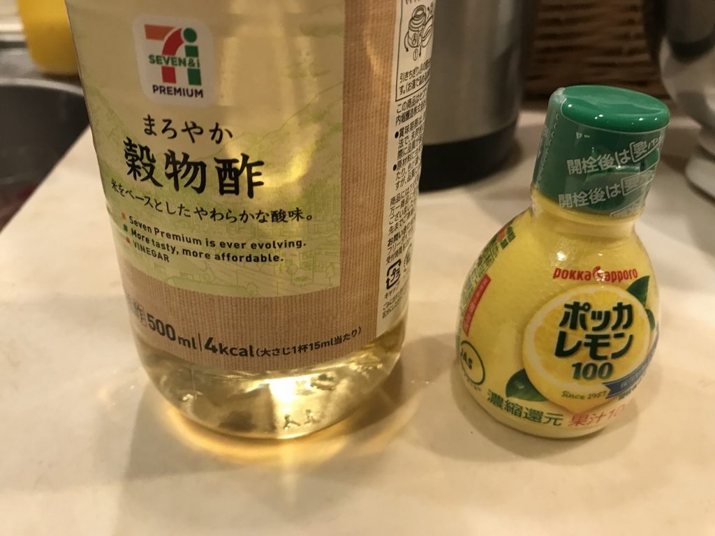 酢については、あまり酸っぱい紫蘇ジュースは好きでないので、今回はセブンイレブンで買った穀物酢50㎖とポッカレモン50㎖入れてみました。
