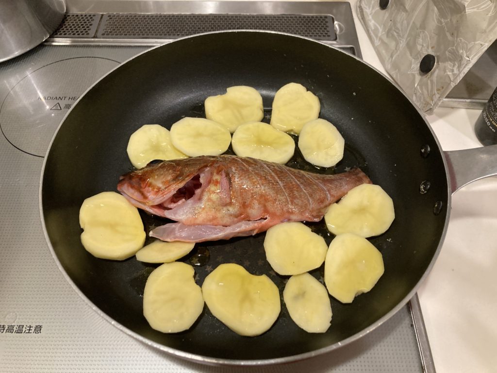 ①フライパンに下処理したカサゴを入れてその周りにジャガイモを並べでハーブソルトとオリーブオイルを適量掛けます。