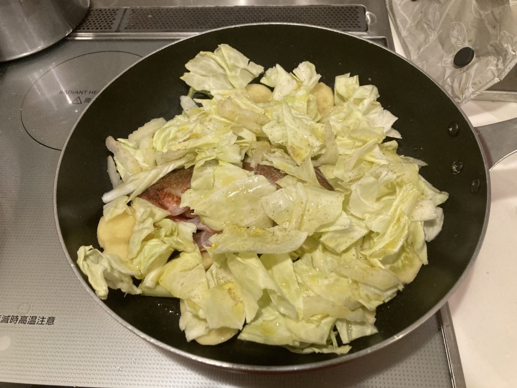 ②その上にキャベツを敷いてハーブソルトとオリーブオイルを適量掛けます。