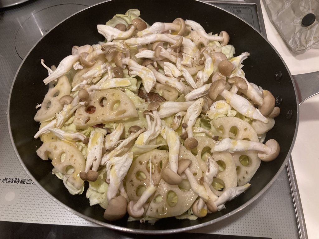 ③その上にレンコンとしめじを載せてハーブソルトとオリーブオイルを適量掛けます。