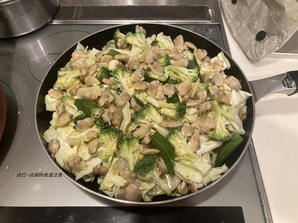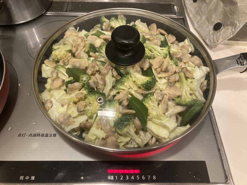 ④更にその上にブロッコリー、オクラ、アサリ(殻付きでもOK)乗せてハーブソルトとオリーブオイルを適量掛けます。