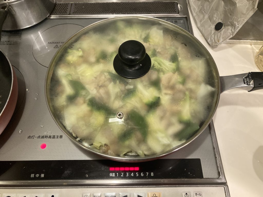 ⑥フライパン内に水蒸気が溜まってきたらその後10~15分煮て完成です。