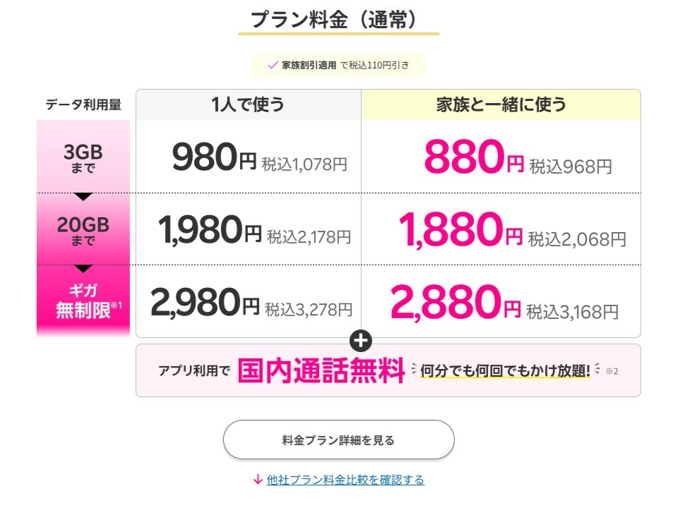 3GBまでは980円(+通話料金)でそれ以上使うと自動的に料金が切り替わります。