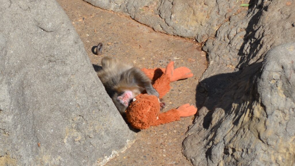 その後人工保育機での飼育が始まり、動物園で用意したオランウータンのぬいぐるみを「パンチくん」に母ザルの代わりに与えました。