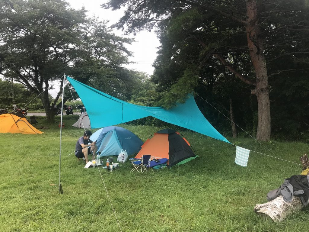 私のテントは雨仕様じゃないので、テントの上にタープを張りました。実は今回、結婚して子供がいる長年が小学生の時に使っていたタープを20年ぶりに使いたくて持ってきていました。それが積み荷が重い原因の一つではあったのですが…。