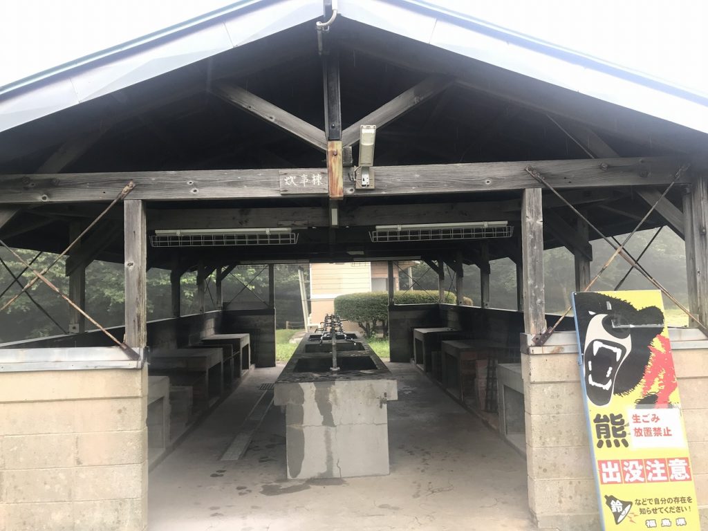 この「市営あだたら高原野営場」は利用料が無料で、簡易水洗ですが、新しいトイレが有ります。また、きれいとは言えませんが炊事場が有り、中学生時代の夏山教室やサーマースクールを思い出させるシーンも有りました。