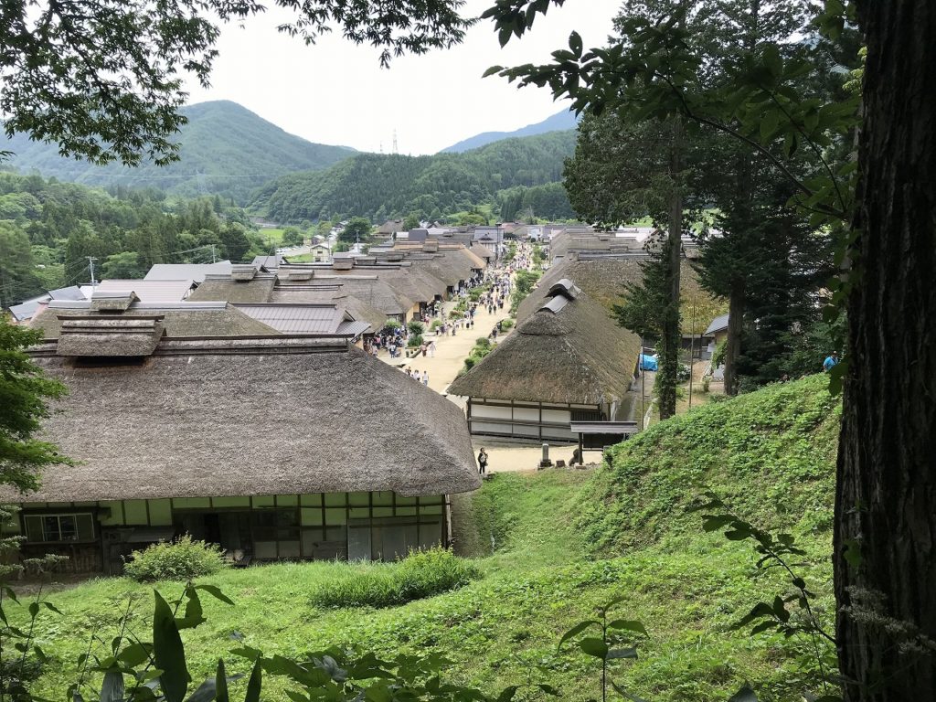 次のスポットTさんのリクエストで2番目のお題目である、大内宿です。茅葺屋根の古民家がたたずむメイン通りは、通りすがりのお母さんがご推薦の小高い場所から見下ろすと、まさに圧巻の風景でした。