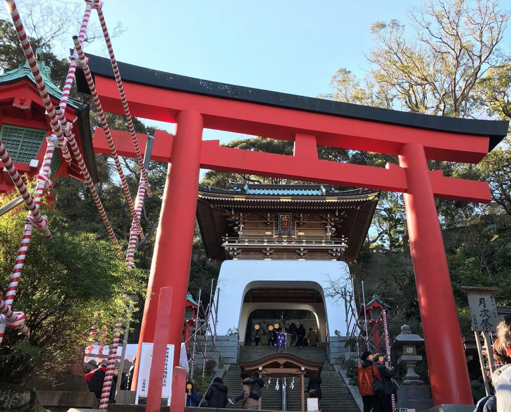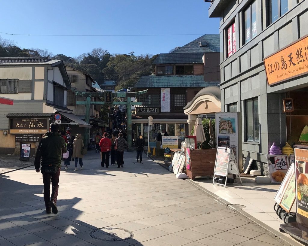 江の島は島全体が神社で鳥居を潜ると急な坂道の参道が有り、お土産屋さんとかお食事処がたくさんあります。