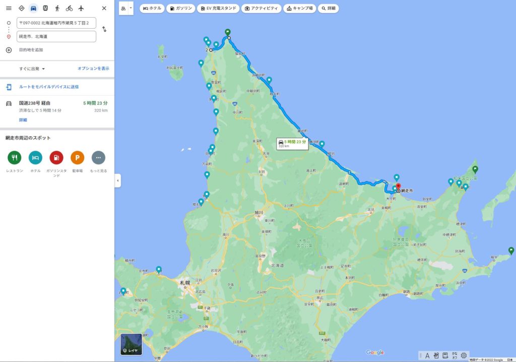 国道238号線で流氷で有名な紋別やサロマ湖を経由して約320km走ることになります。