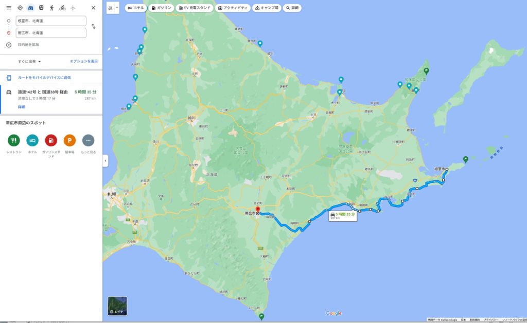 そして十勝川を渡ったら川の上流方面に右折して帯広に到着する予定です。