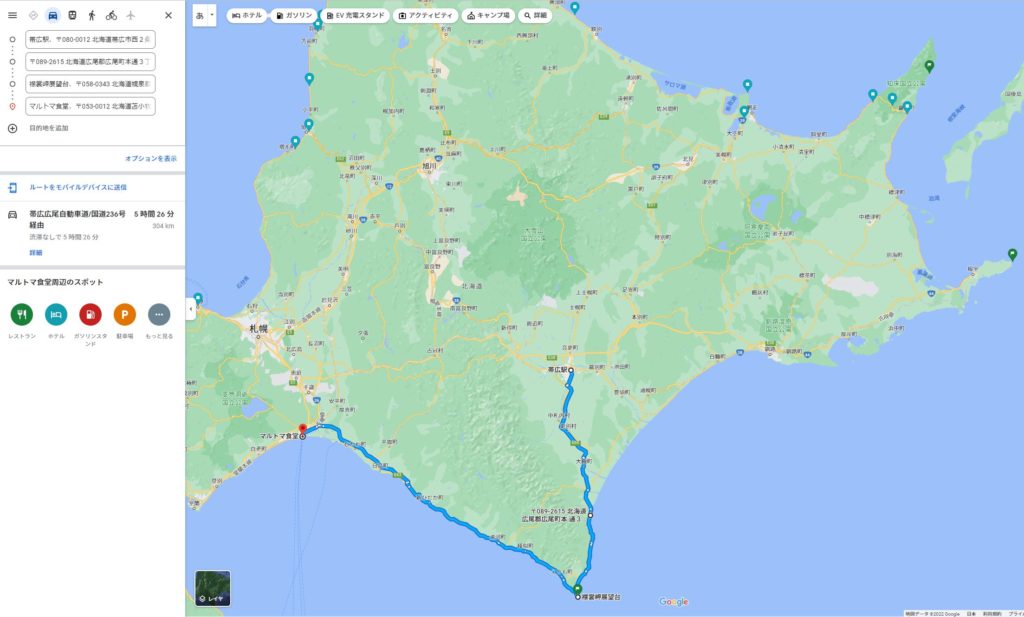 その後は海沿いの道を西に向かい苫小牧まで約304km走ります。