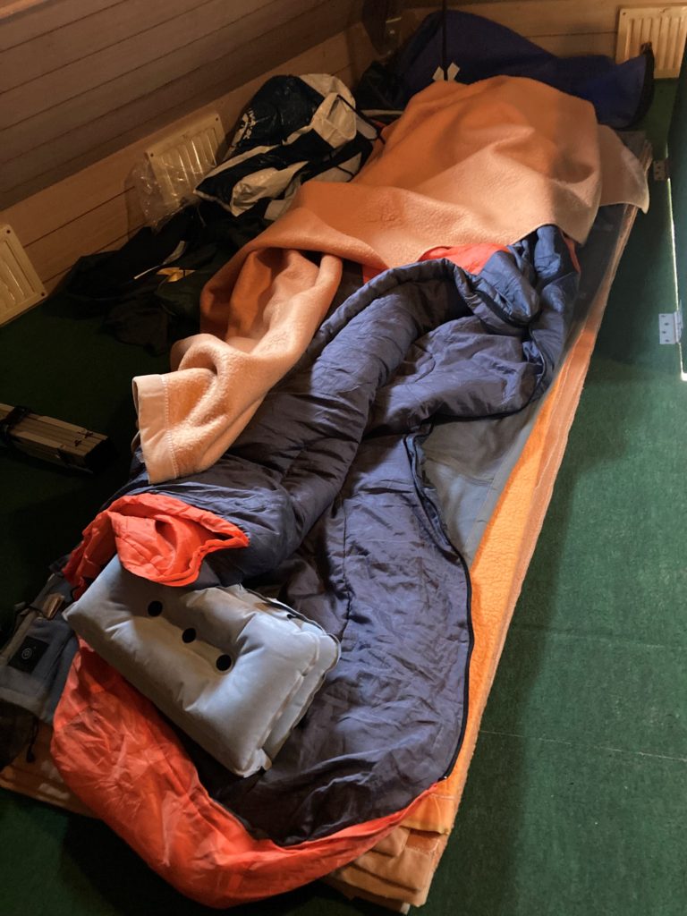備え付けの毛布を5枚敷いてその上に、エアマット、電熱マット、寝袋、毛布1枚をかけて寝ました。