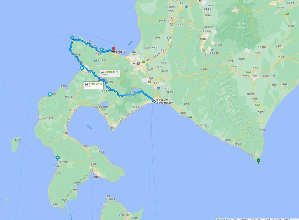 さて一番最初の計画では、2日目は函館~小樽に向かうルートでしたが、北海道上陸地点が苫小牧になったので下記のルートに変更しようと思います。