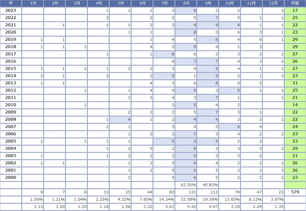 2000年から2023年の間で台風が最も発生した月はやはり8月でした。