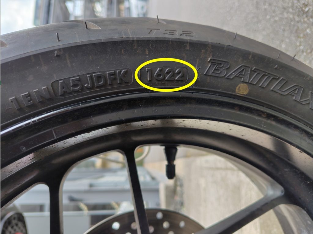 ネット上では上記の記載がされていたので自分のバイクのタイヤを早速見てみましたが、良く分かりませんでした。