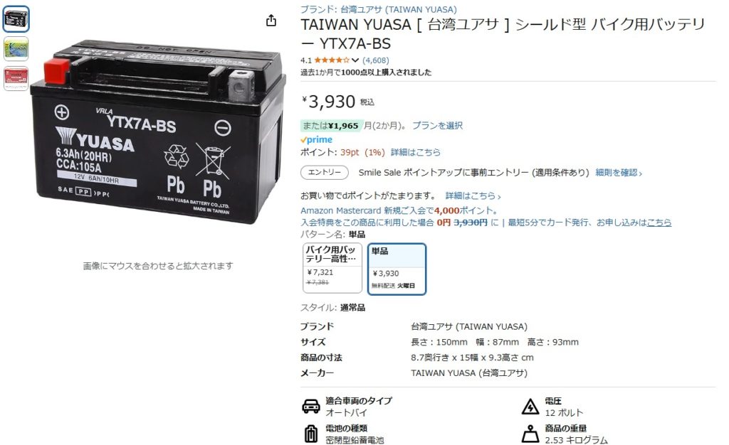 アドレス125のエンジンがセルモーターでかからなくなったので、4年前の2021年に直ぐバッテリーを購入しました。