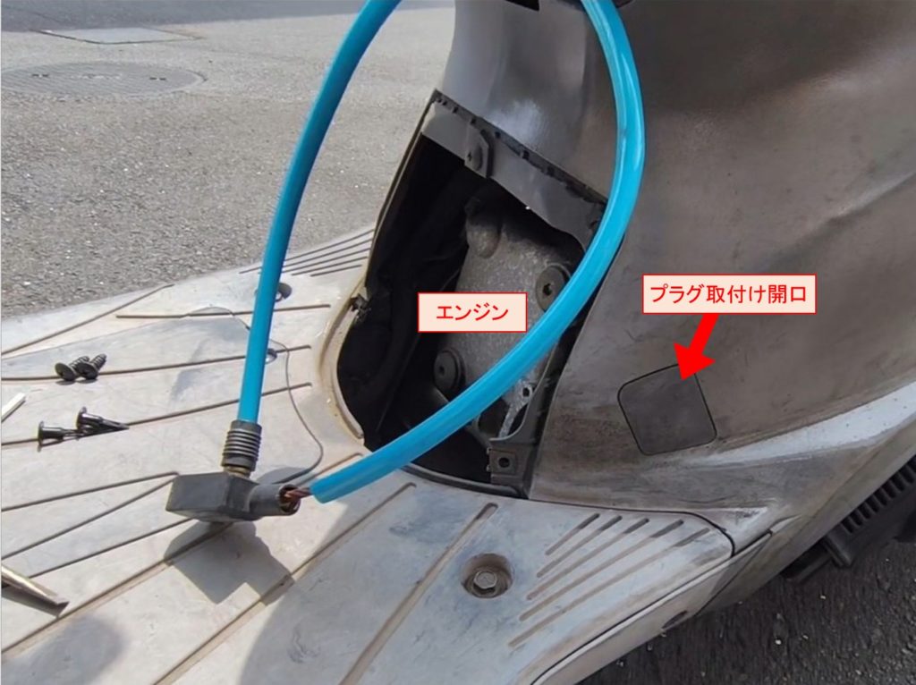 最初に開けた大きな開口の右端に手を突っ込んでプラグキャップを外します。