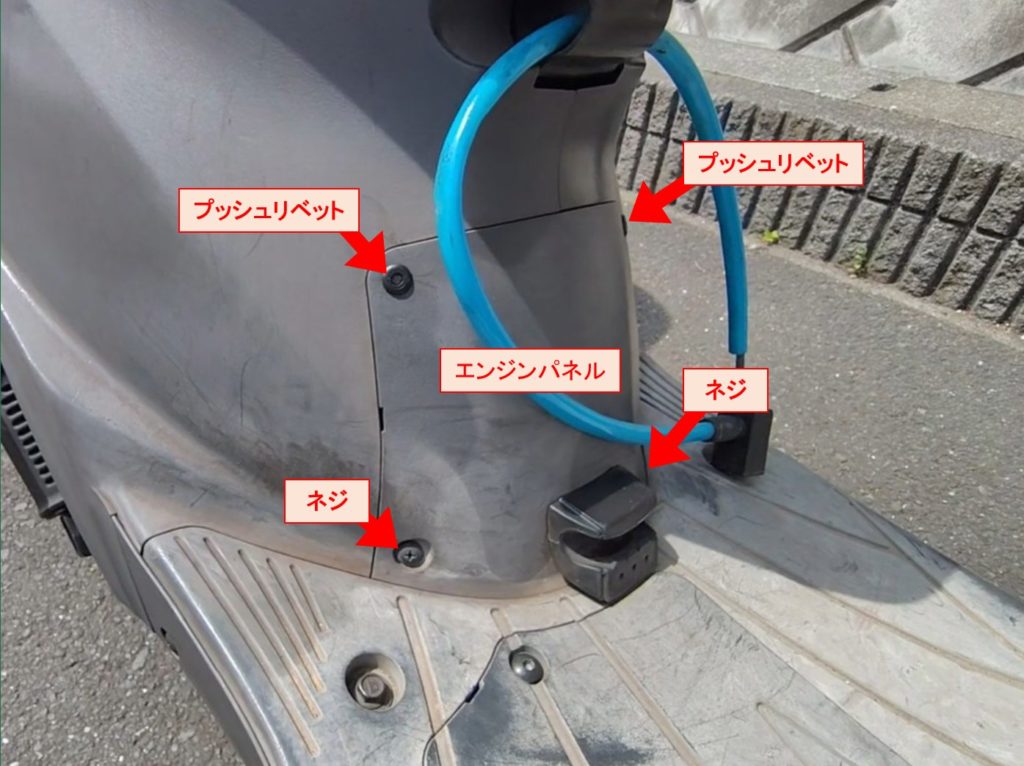 先ずこのエンジンパネルの下2ヵ所のねじと、上2ヵ所のプッシュリベットを外します。